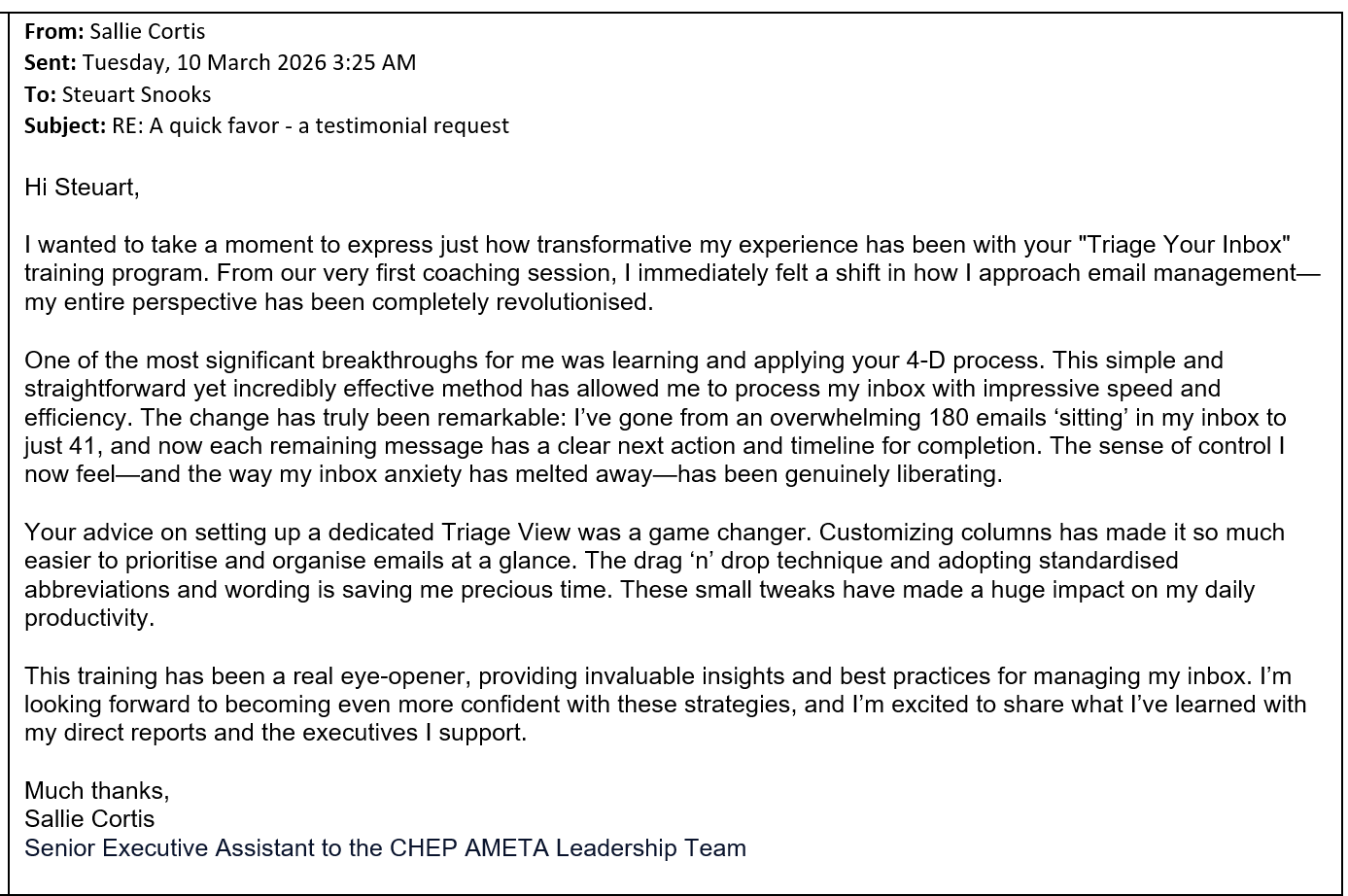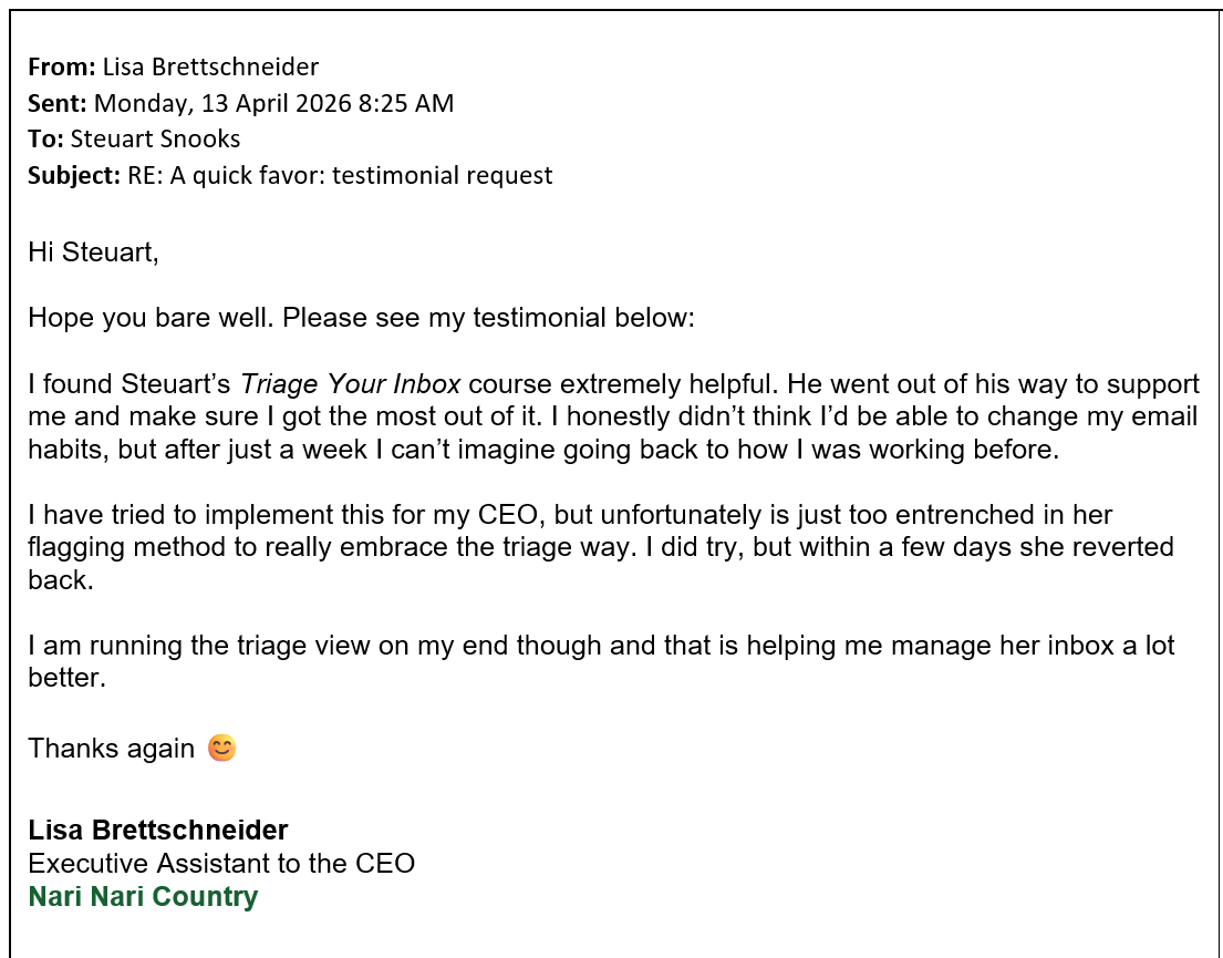 The Triage View continues to revolutionise the way email is managed by EAs. See the following feedback from recent EAs who loved the impact of settng up the Triage View and Process has made for their email and workload management habits.