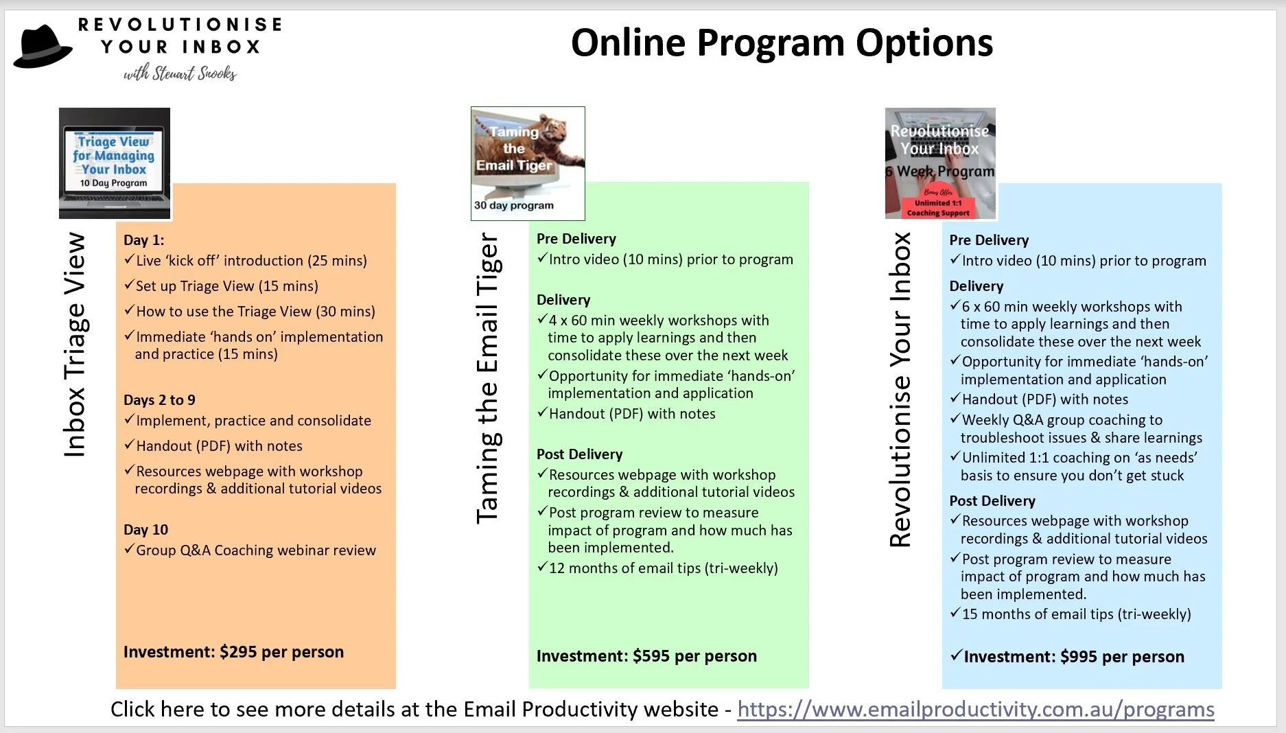This short video explains three options to suit your timeframe and budget. Whatever option you choose will help you to control of your email and workload.